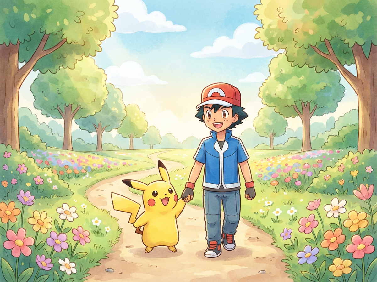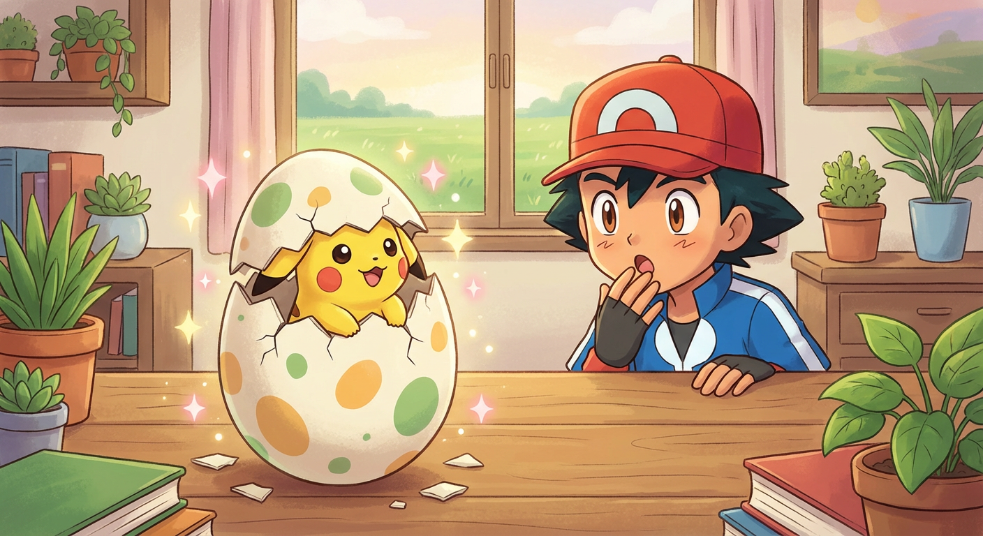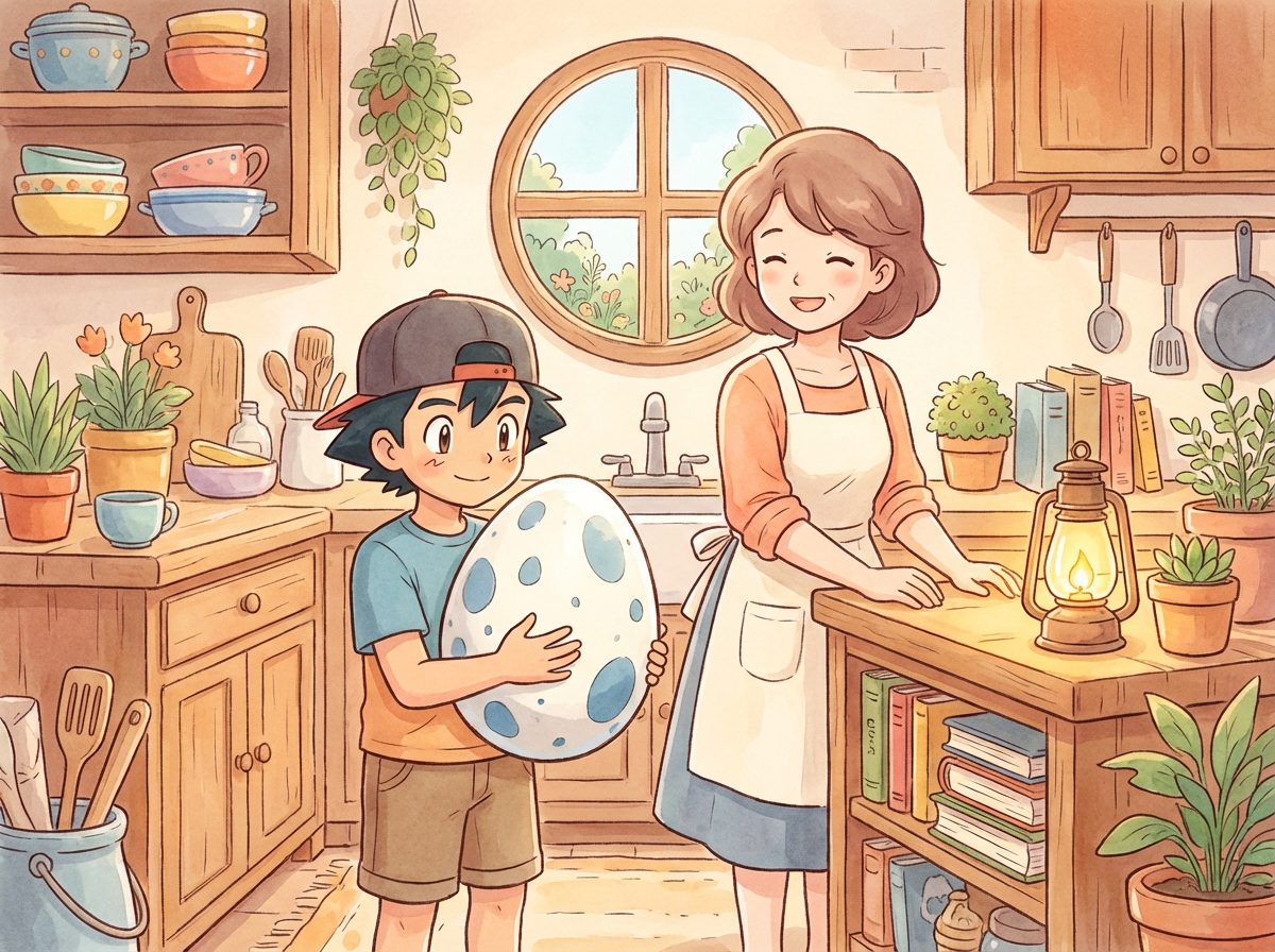 Ash’s mom gave him a warm, speckled egg. Ash held it carefully and whispered, “I wonder who is inside!” He hoped it would be a Squirtle, splishy and brave.