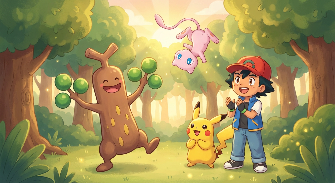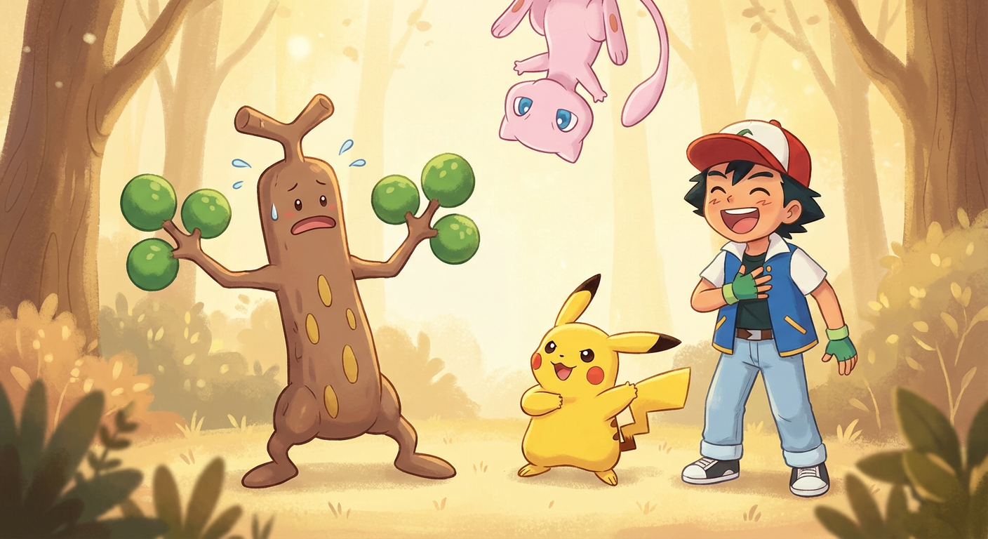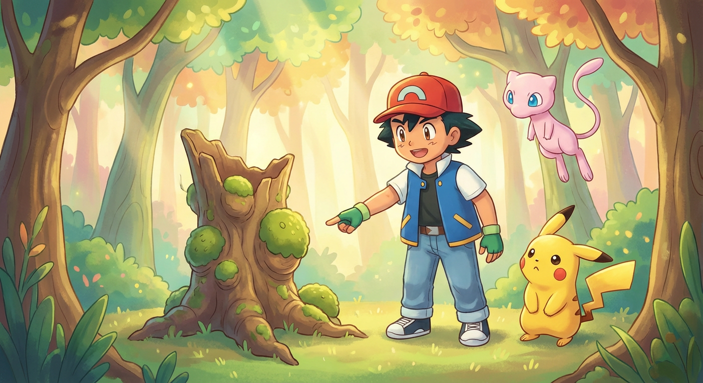 It wasn't a tree at all—it was a Sudowoodo! The funny creature froze like a statue, trying to pretend it was wood again. Ash laughed kindly, "You don't have to hide, we just want to play!"