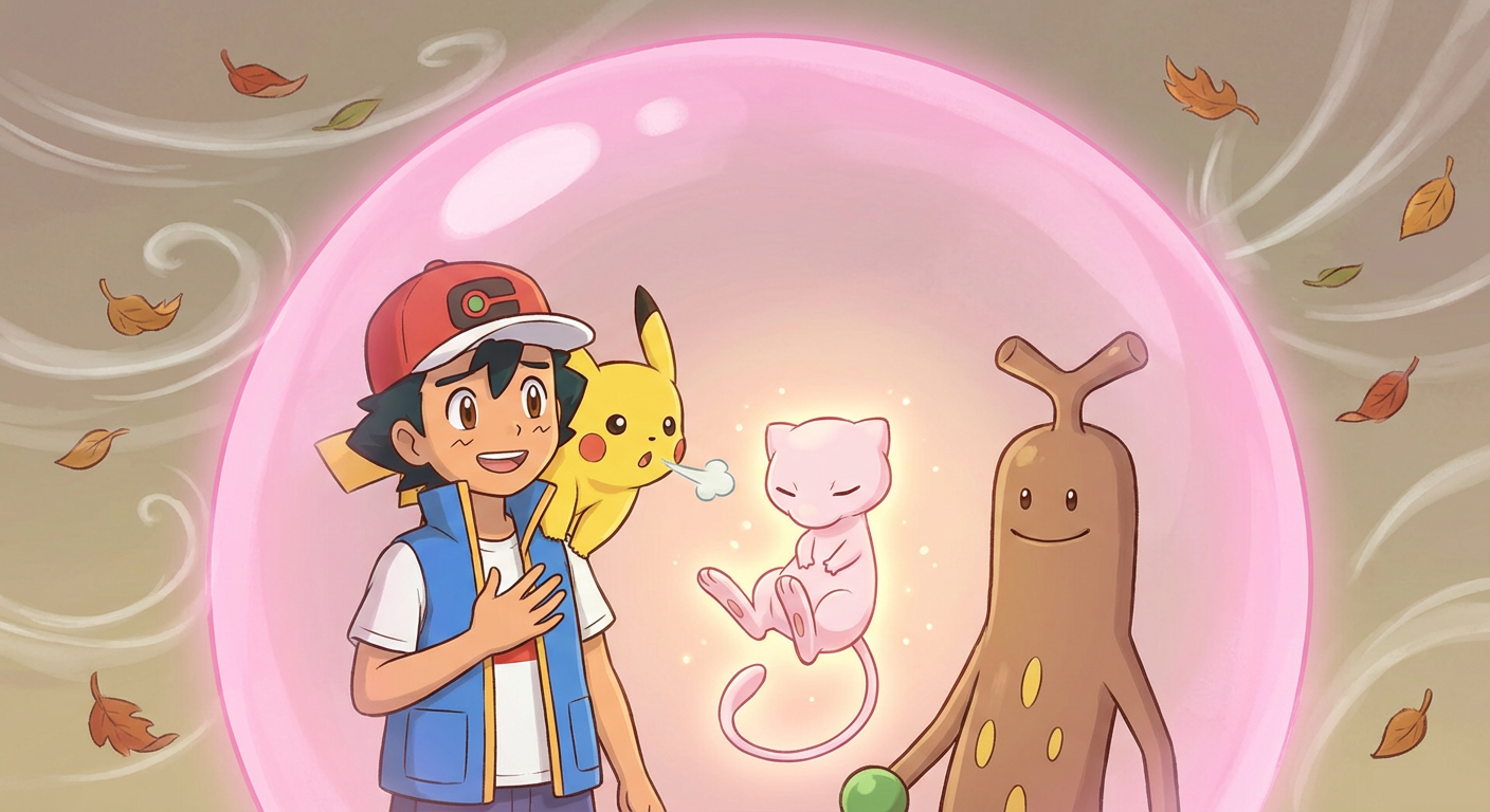 When the wind finally stopped, the bubble popped with a sparkle. Sudowoodo did a happy little dance to say thank you. Ash smiled, knowing that with Mew around, every adventure would be full of magic.