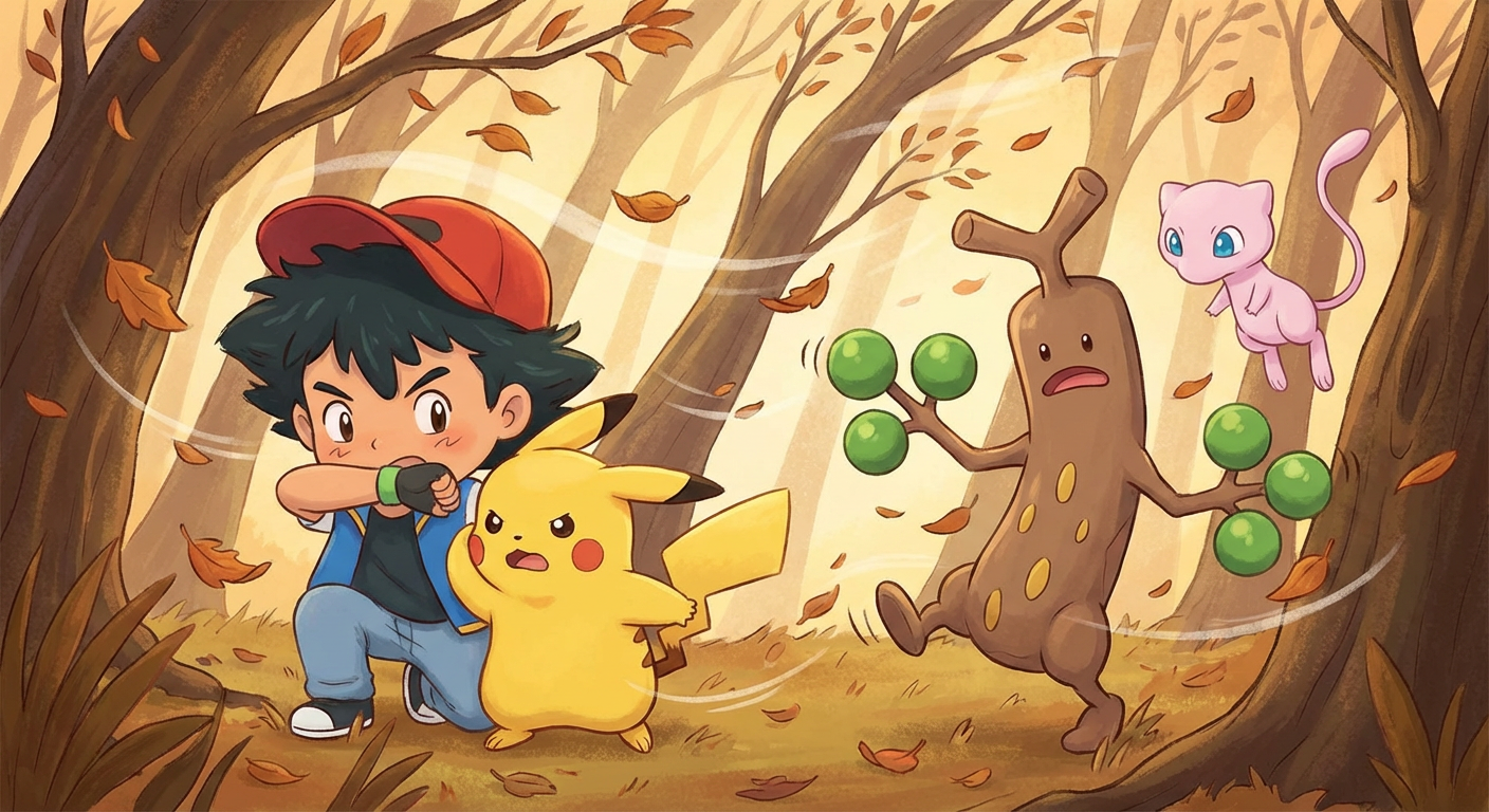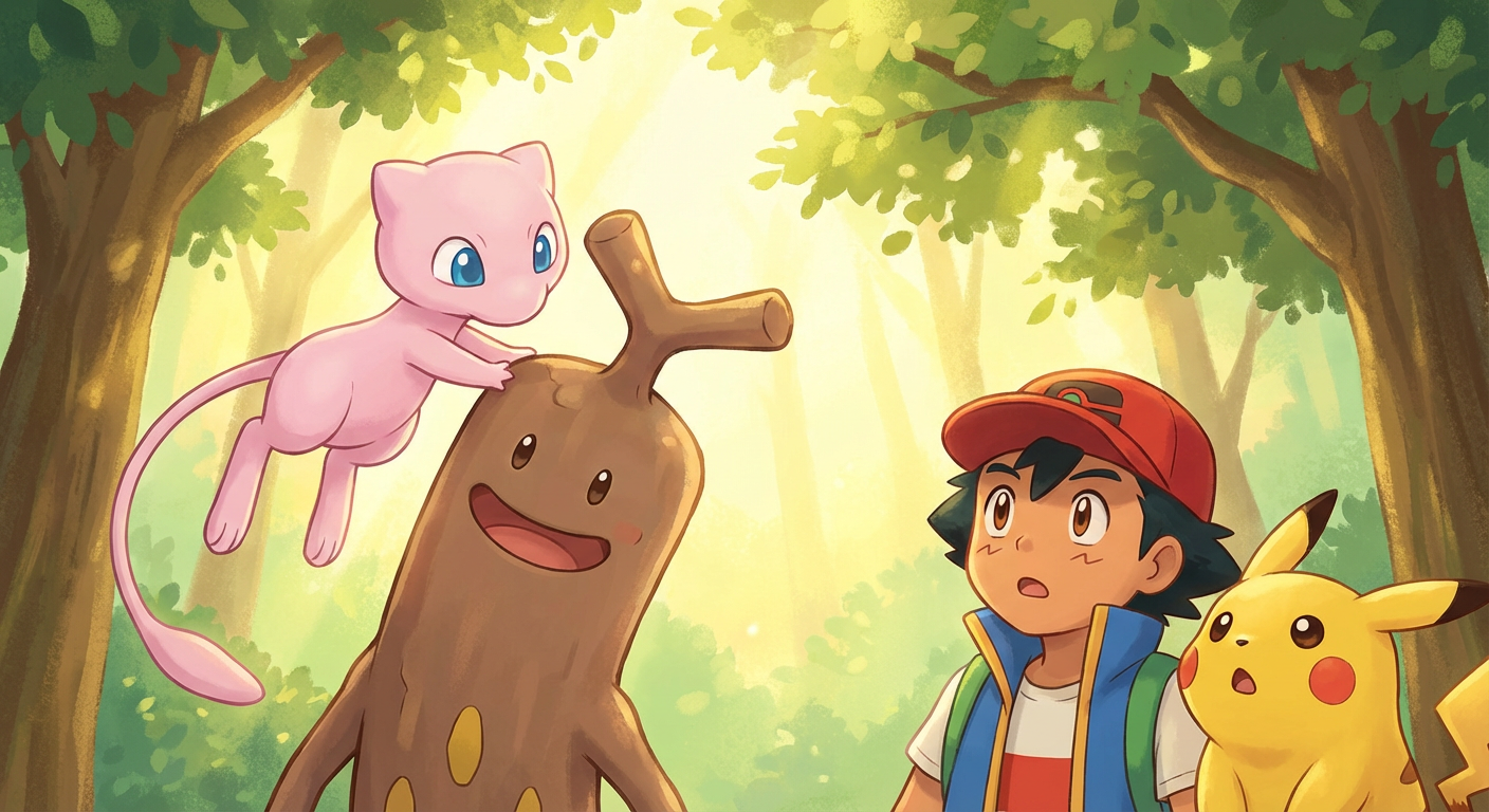 Ash, Pikachu, and their new friend Mew hiked into a strange part of the forest called the Wobbly Woods. The trees here didn't stand still; they seemed to sway even when there was no breeze. "Look at that funny tree!" Ash said, pointing to a brown trunk that was shaking its leaves.