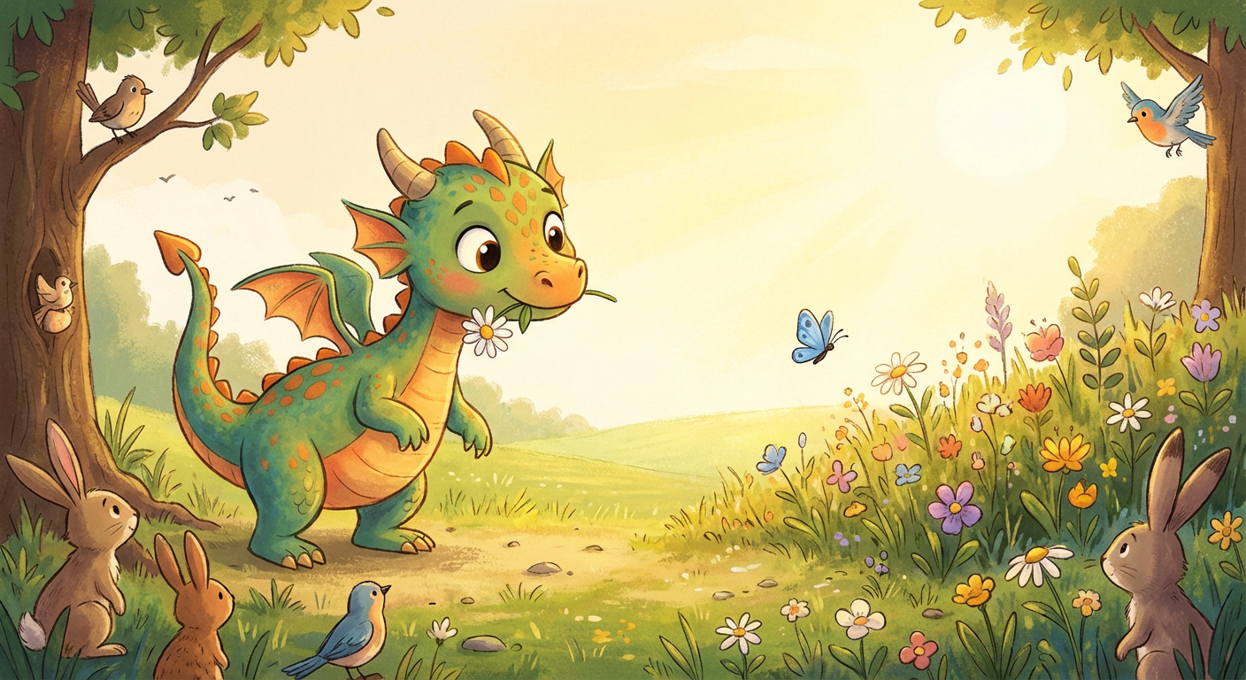 Drew was a brave little dragon who lived near a sunny meadow. One morning, he saw a tiny butterfly with bright blue wings fluttering all alone. "Hello! I'm Drew," he said gently.