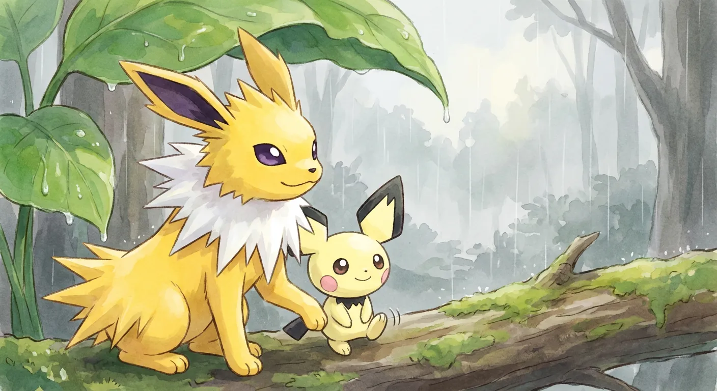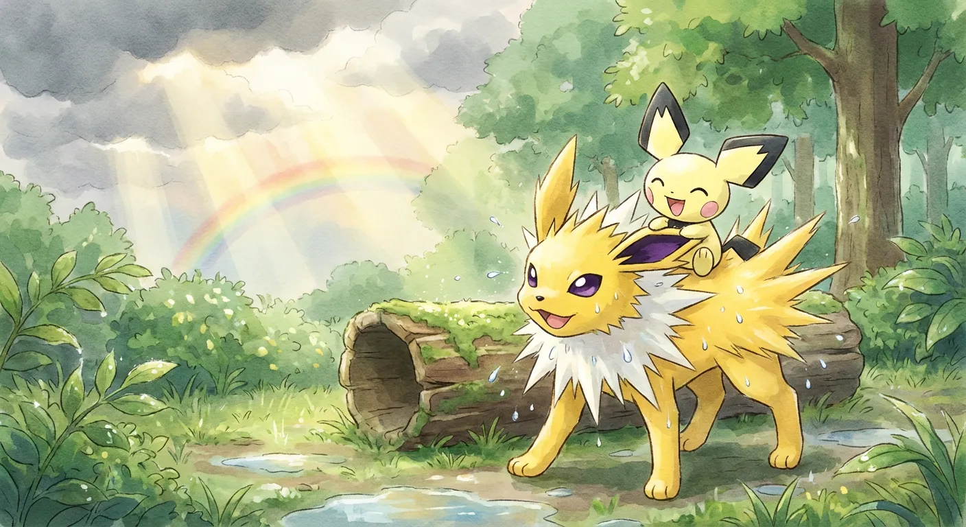 Suddenly, the blue sky turned a deep, sleepy gray, and heavy rain began to tap-tap-tap against the leaves. While the other forest friends hurried to their burrows, Jolteon stood tall, his yellow fur glowing softly in the dim light. He wasn't afraid of the storm because electric sparks were now a part of him.