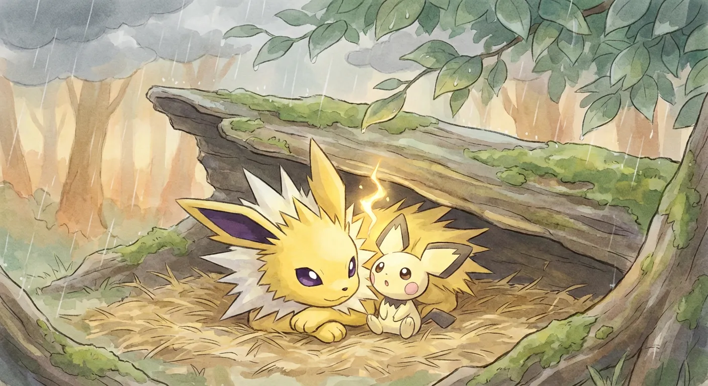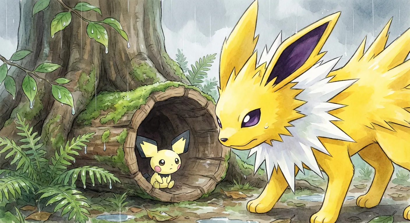 CRASH! A loud clap of thunder shook the ground, and Pichu squeaked, burying its face in Jolteon's white fur collar. "The sky is angry!" Pichu cried, trembling with fear.