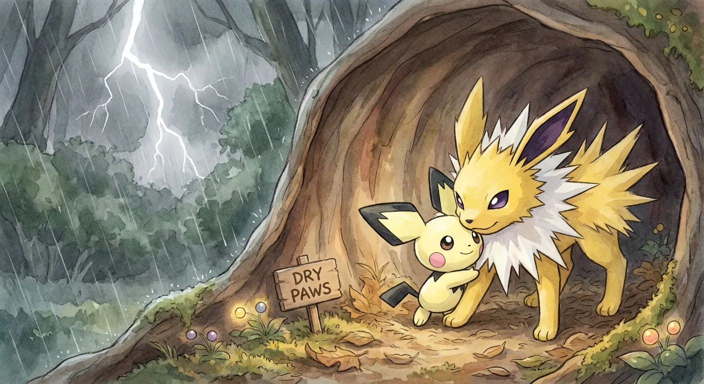 Jolteon nuzzled the little mouse and let a gentle, warm spark dance between his ears. "The sky isn't angry," Jolteon explained with a smile. "It's just playing a song, like a big drum in a parade."