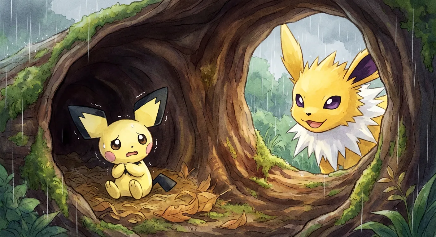 Inside the log sat a tiny Pokémon huddled in a ball—it was a little Pichu! The poor thing was shivering and covering its eyes with its small paws. "It's okay," Jolteon whispered gently, "I'm friendly."