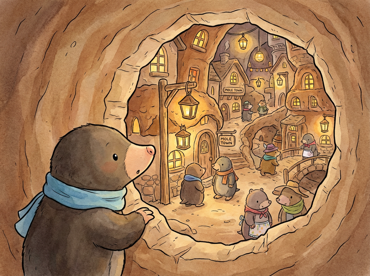 Milo peeked through the opening and gasped. There was another underground city, with twinkling lanterns and busy mole shops! Milo remembered his brother Max, who had wandered away long ago and never came back.