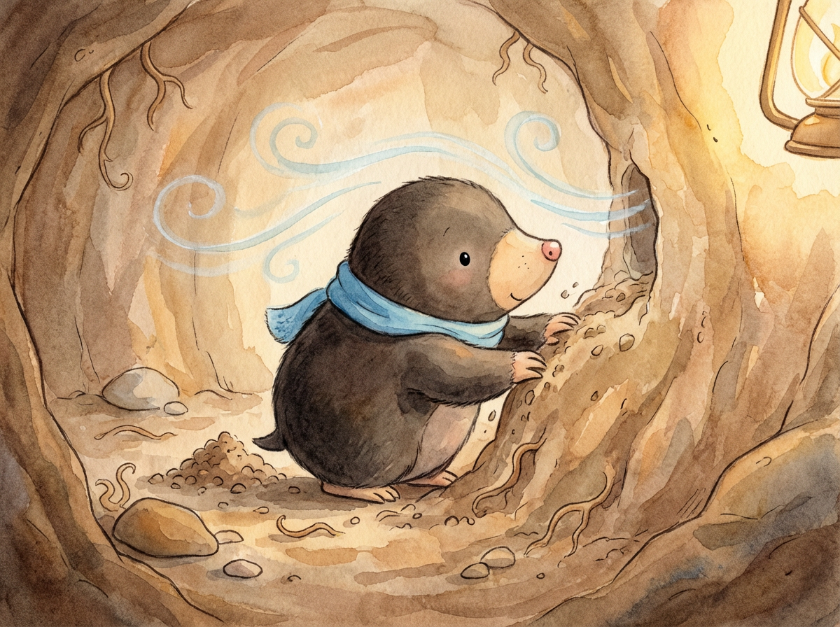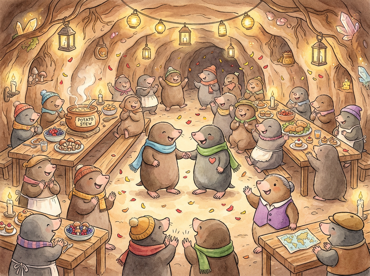 Deep underground, Mole Town was very busy. Moles hurried through tunnels, carrying berries, seeds, and shiny pebbles. Milo the Mole helped too, but he kept thinking about one special thing: potatoes!