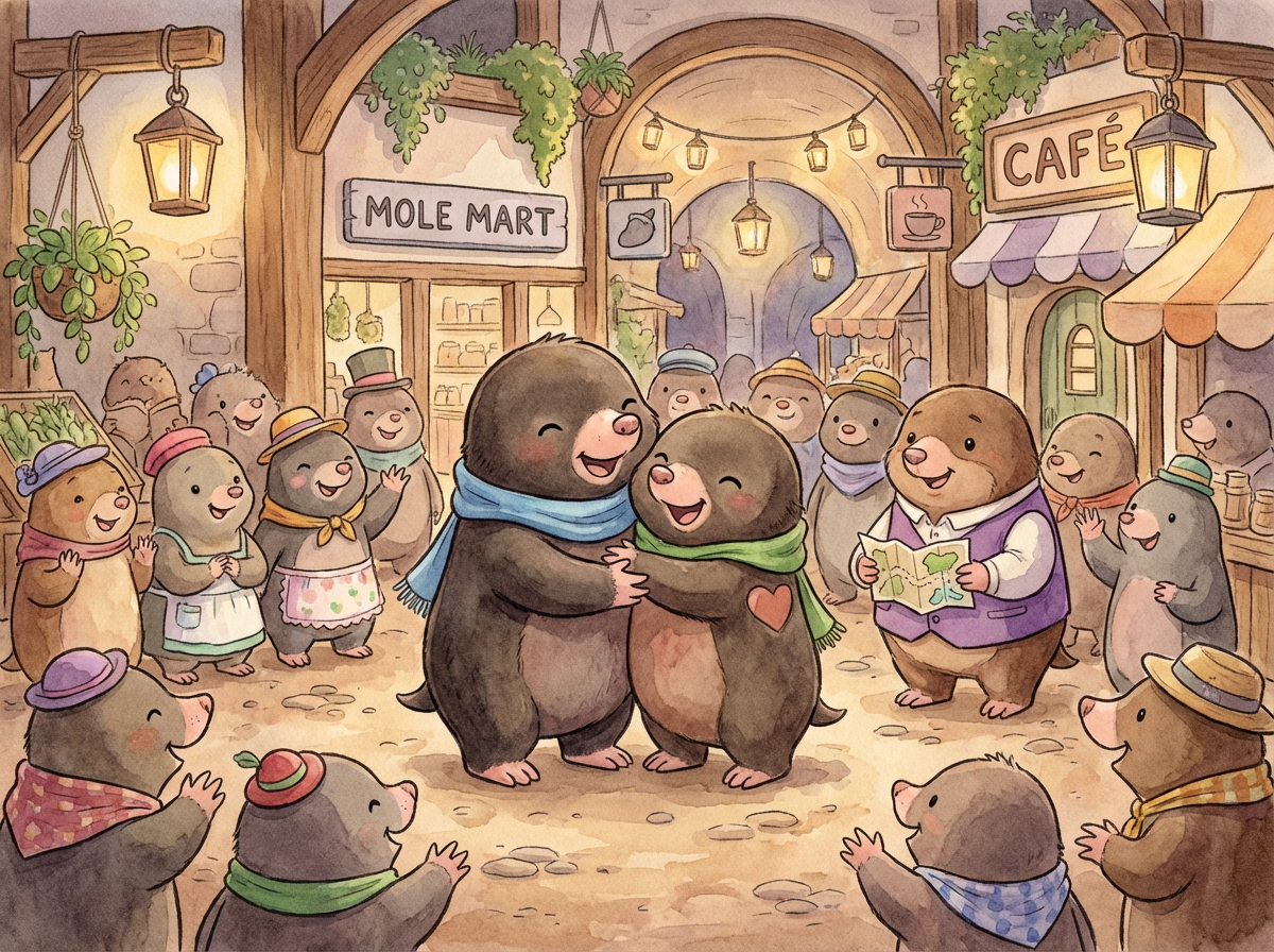 Milo walked into the new town and asked kindly, "Have you seen a mole named Max?" A mole with a green scarf stepped forward. "Milo?" he said softly, and they hugged tight because it was Max!
