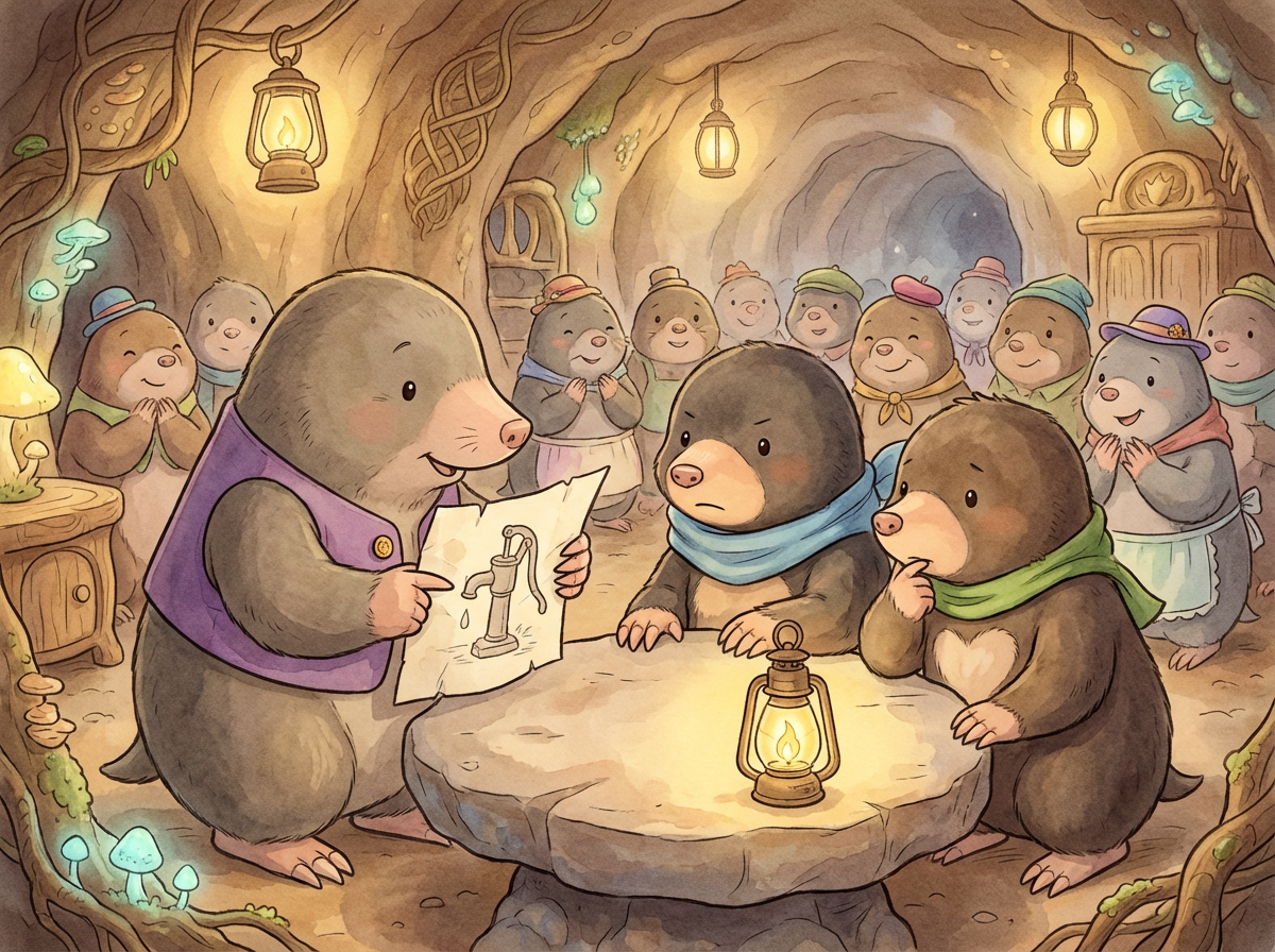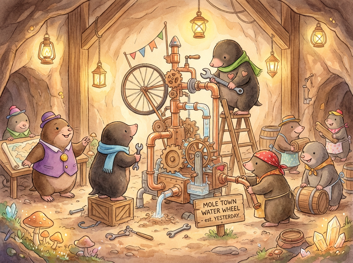 The moles gathered scrap metal, old pipes, and a big bicycle wheel they had found in the dirt. Clang, bang, twist! They worked together to build the Super-Splasher Pump right at the bottom of the hole.