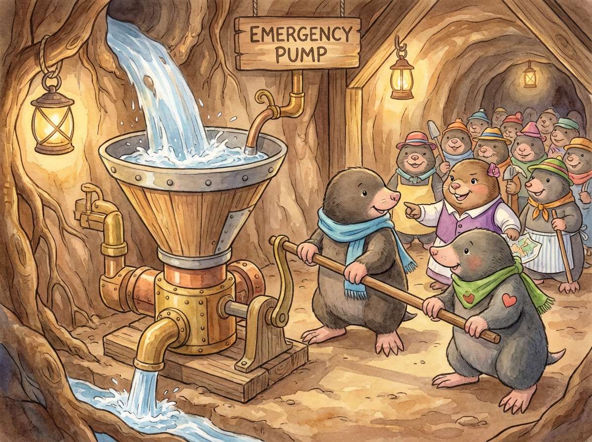 Suddenly, a rumble shook the ceiling. Farmer Fluffy had turned his hose on again! Water rushed down the main tunnel, but this time, it fell straight into the big funnel of the mole pump.