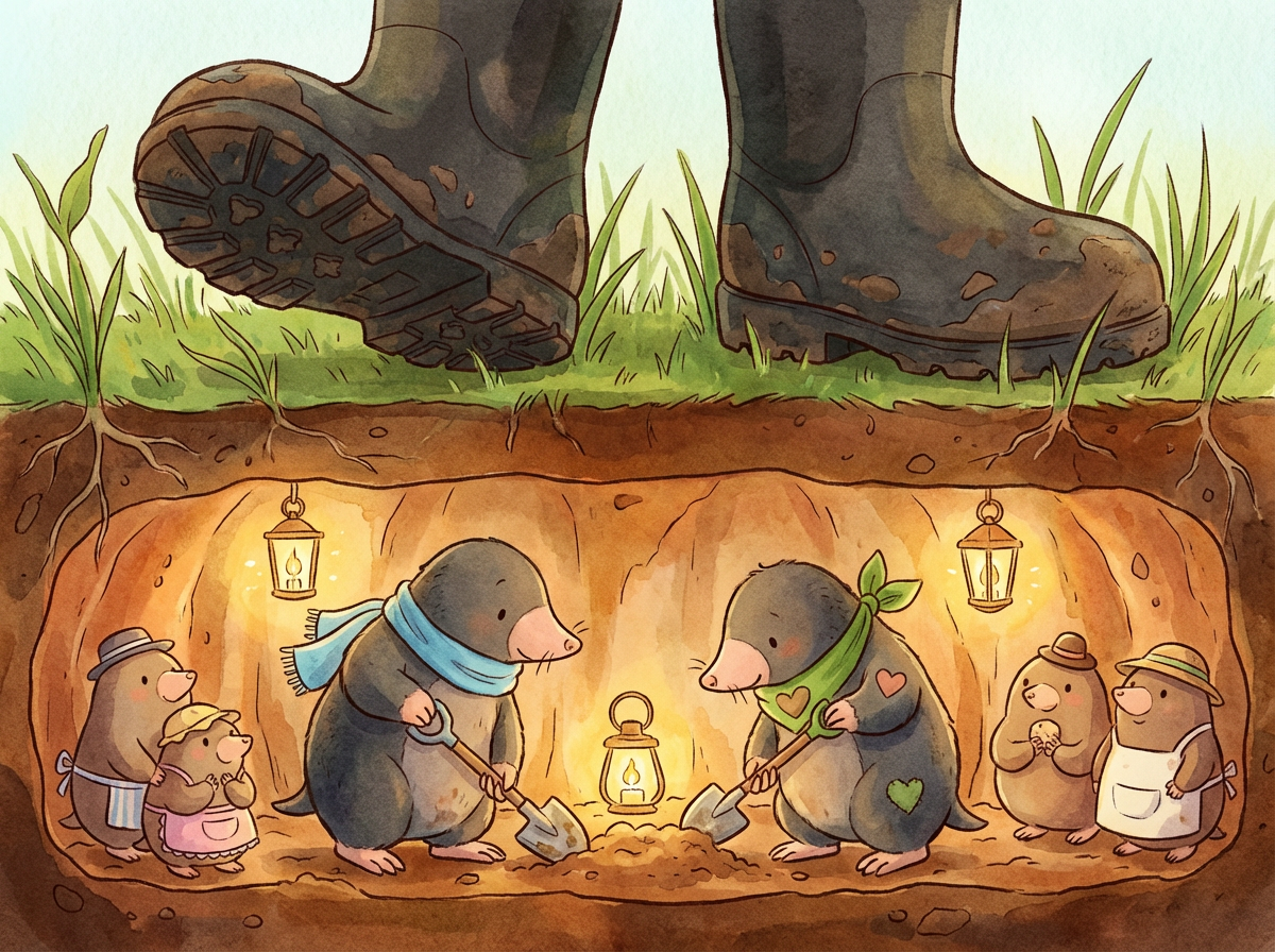 While the pump was being built, Milo and Max dug a tiny, secret tunnel straight up to the surface. They poked a small exit hole right next to where Farmer Fluffy’s big boots were standing. He didn’t notice a thing!
