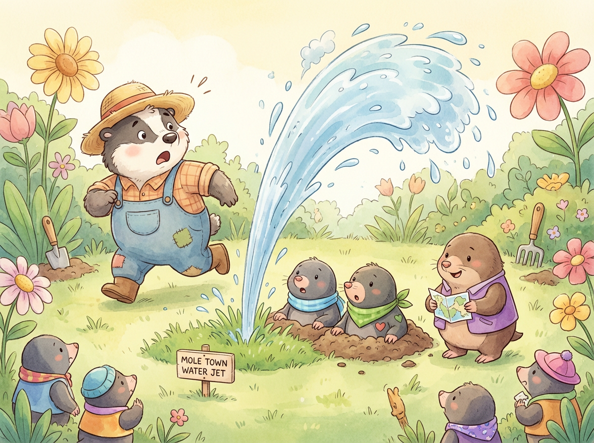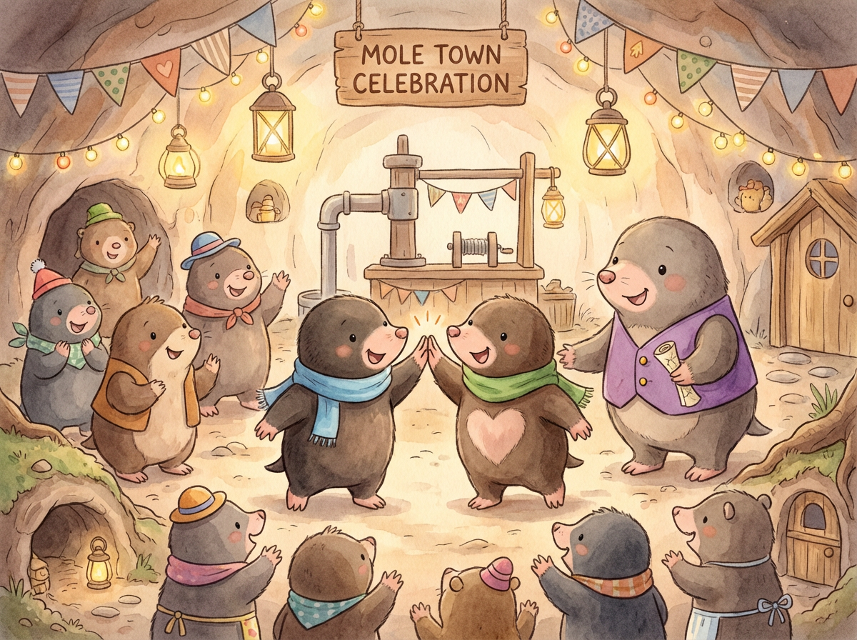 Down below, the moles cheered and hugged because their town was dry and safe. “We make a great team,” said Milo, wringing out his blue scarf. They had won the water battle… to be continued!