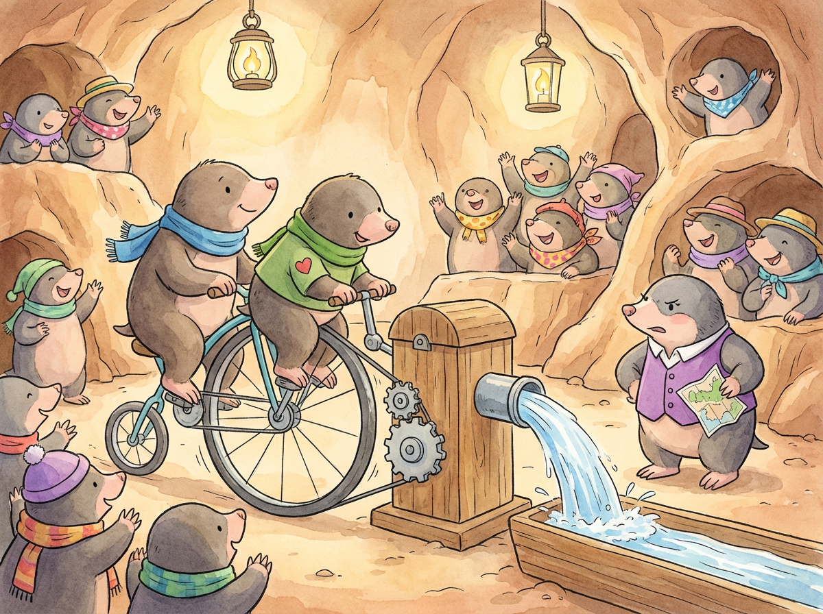 “Now!” shouted Max. The moles cranked the bicycle wheel handle as fast as they could. *Chug-chug-WHOOSH!* The pump grabbed the water and shot it up the secret tube with a giant splash.