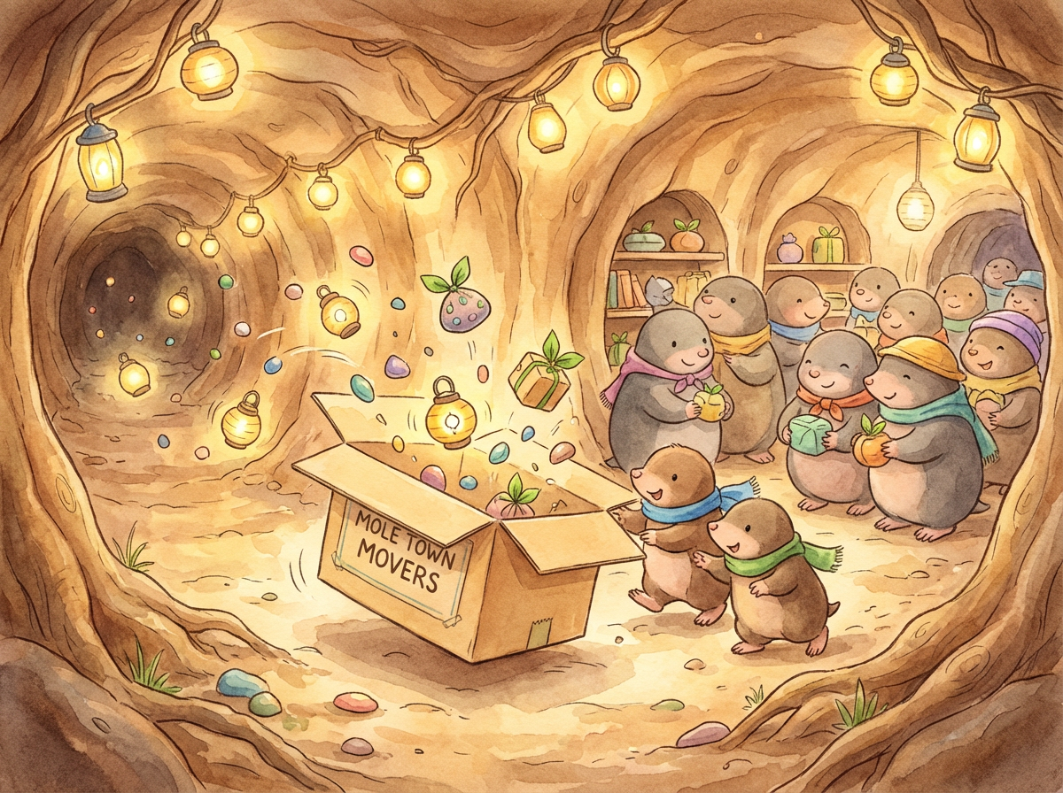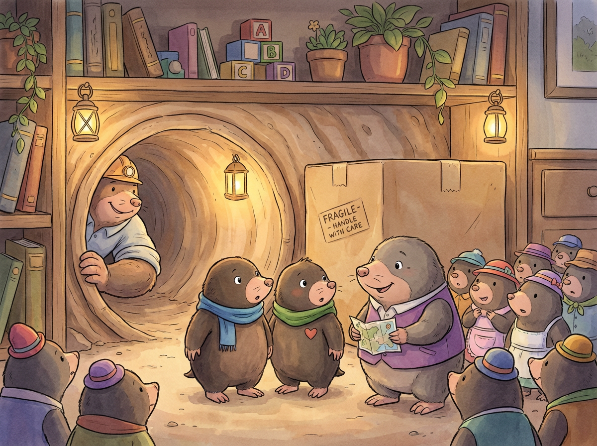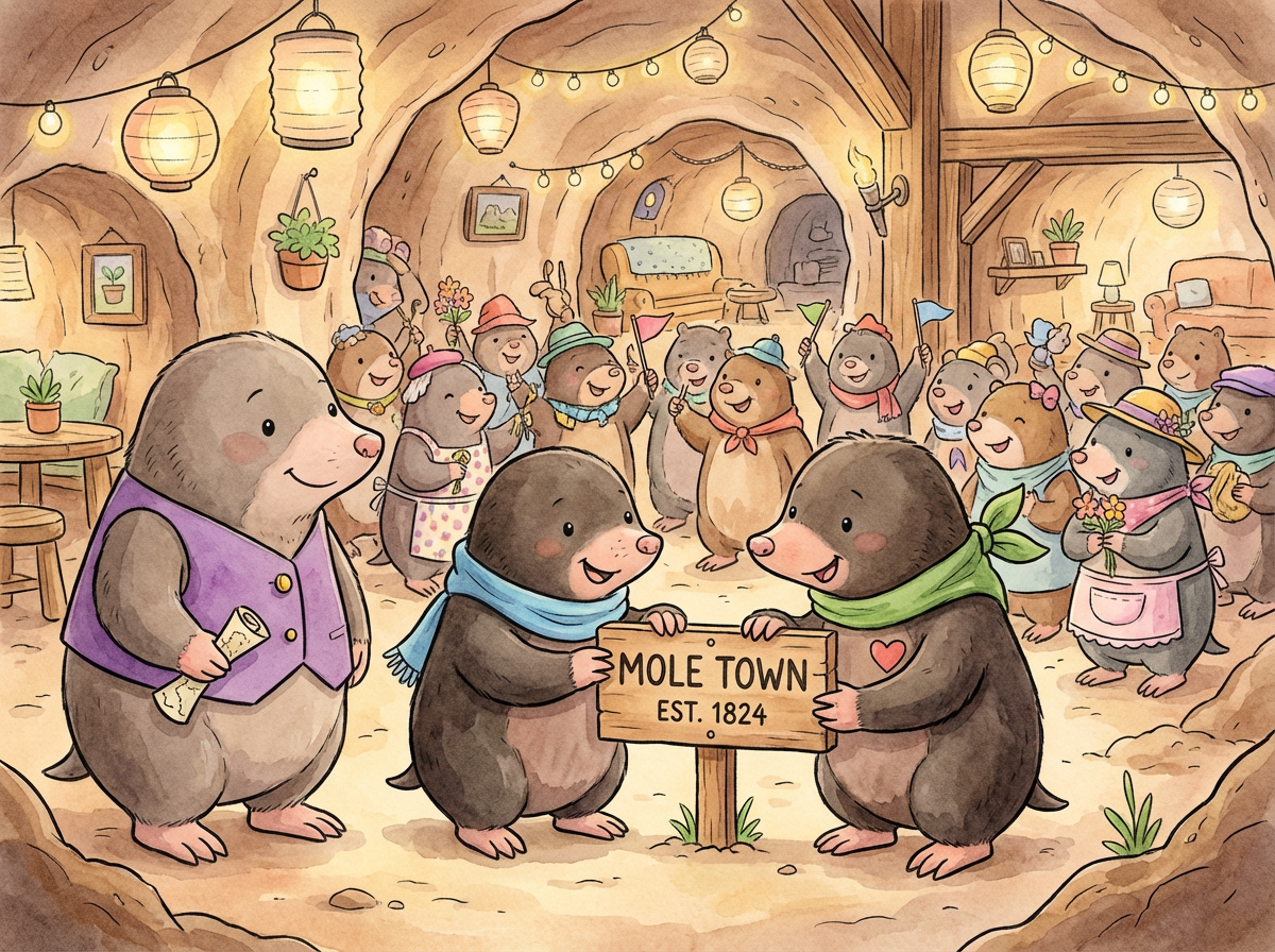 At last, Mole Town was back underground where it belonged. Milo and Max helped straighten a tiny sign while the crowd clapped. Mayor Mabel smiled, "We did it together," and everyone felt safe again… to be continued!