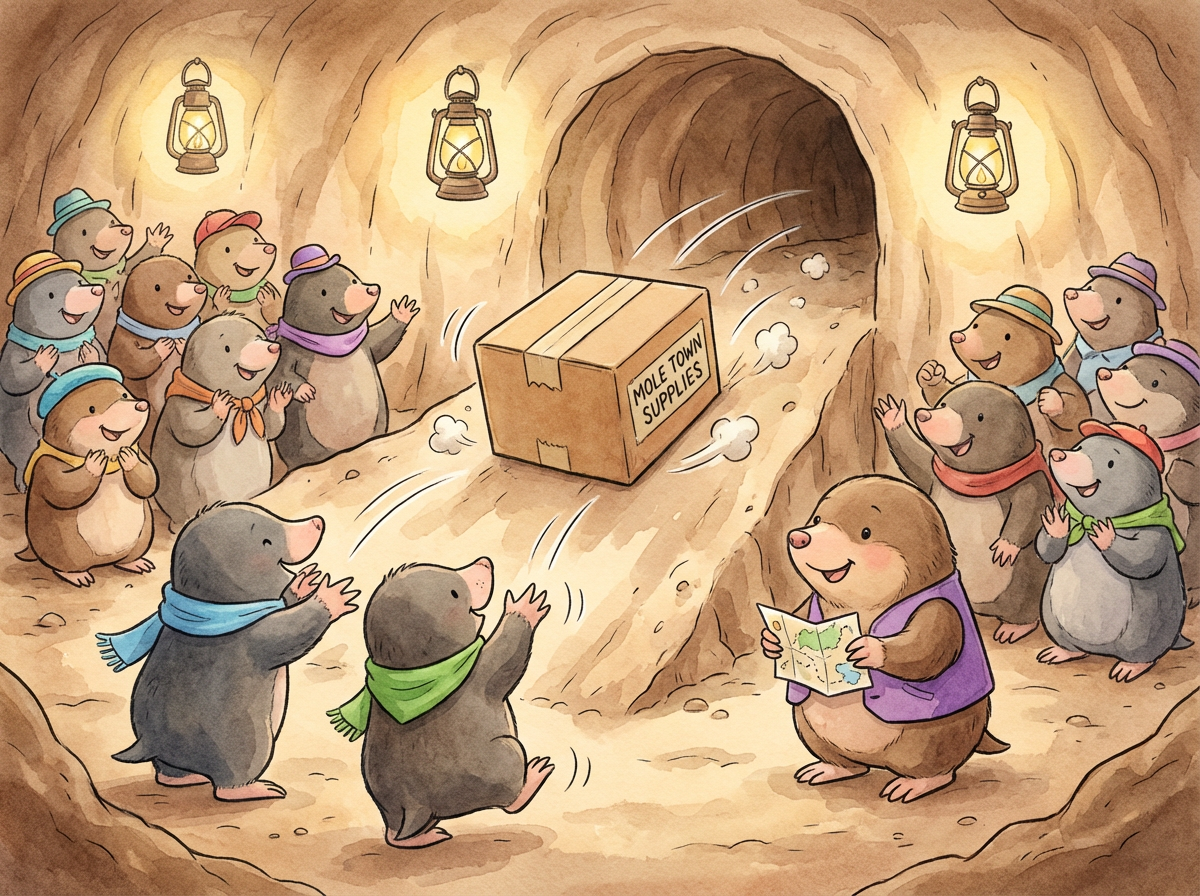 The friend walked up to the big box and tapped it with one finger. Then—whoosh—he lifted it up like it was a feather! The Mole Town Crowd stared with wide, amazed eyes.