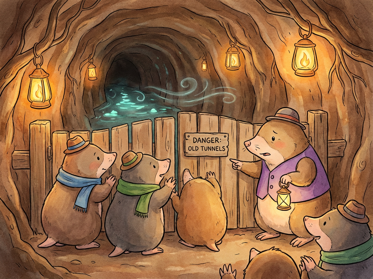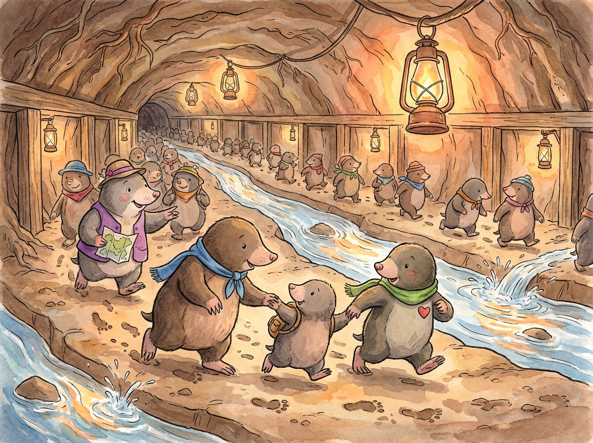 Milo and Max ran as fast as their short paws could go. Behind them, water chased through the tunnel like a shiny river. The Mole Town Crowd hurried together, helping anyone who slipped on the muddy ground.