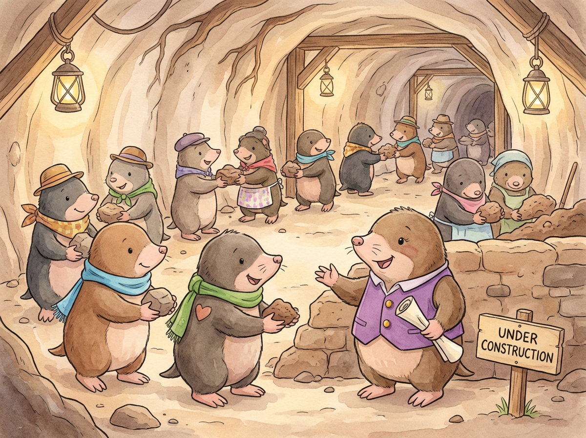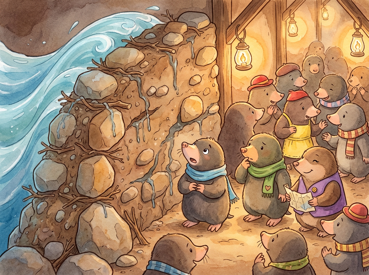 Mayor Mabel opened her map and pointed to a wide hallway. “We’ll build a giant wall right here,” she said. Moles stacked rocks, packed dirt, and pressed clay tight, while Milo and Max passed materials in a fast line.