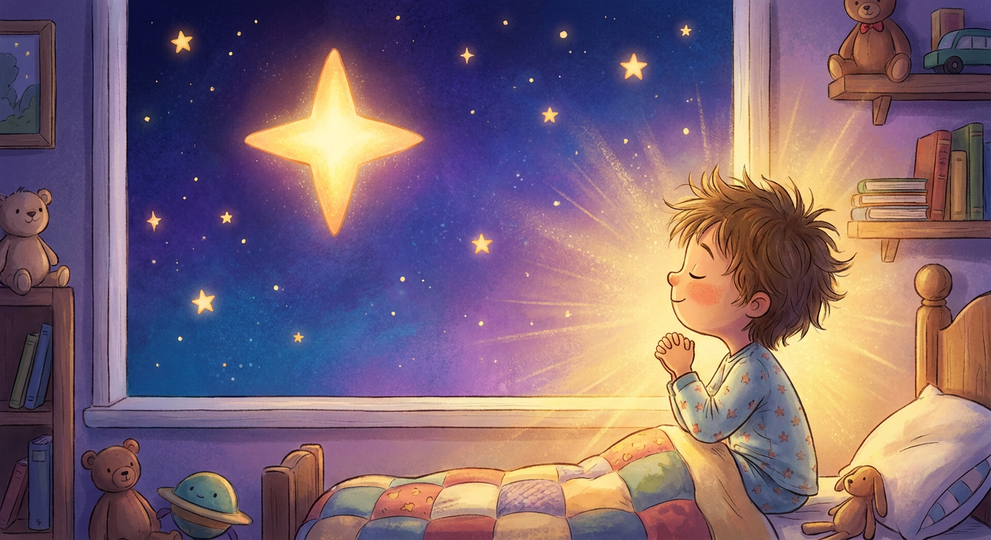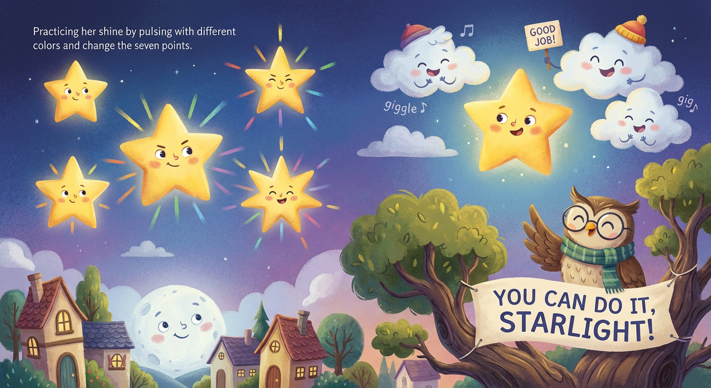 One calm night, a little star named Star twinkled above a quiet town. Star wished to be a special four-star, with four bright points to share. "I will try my best," Star whispered to the moon.