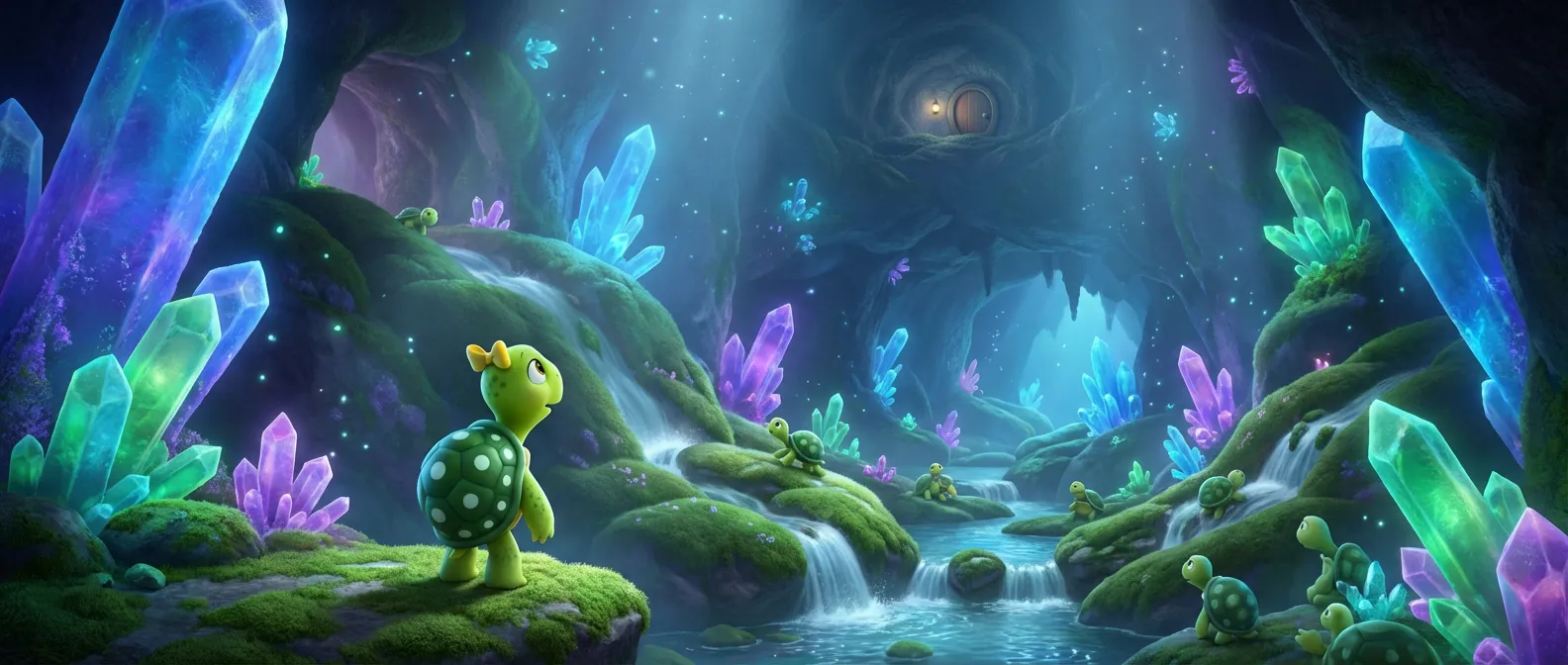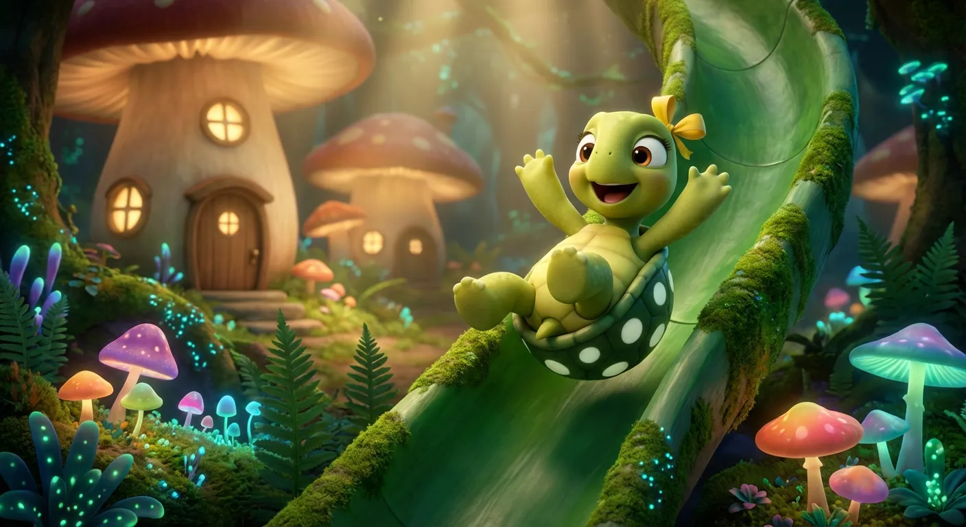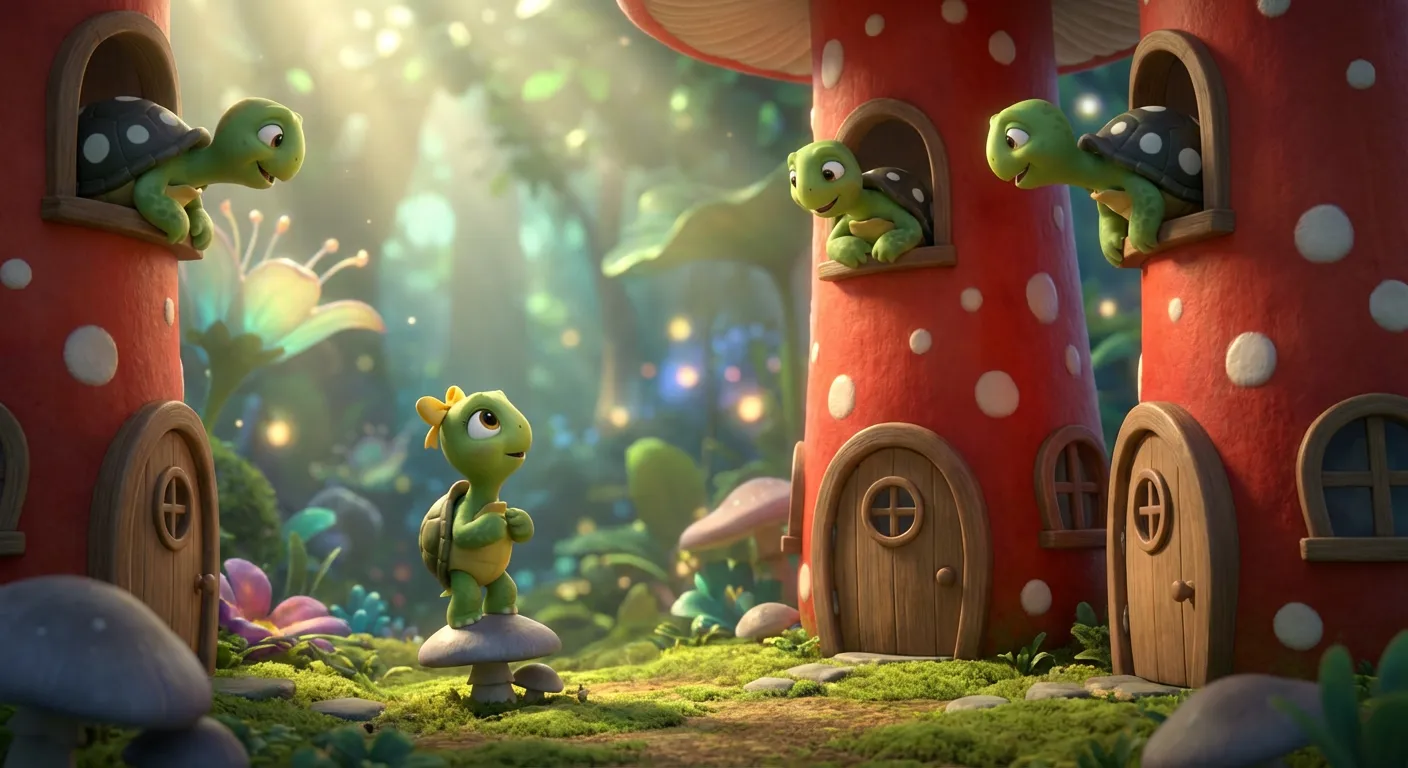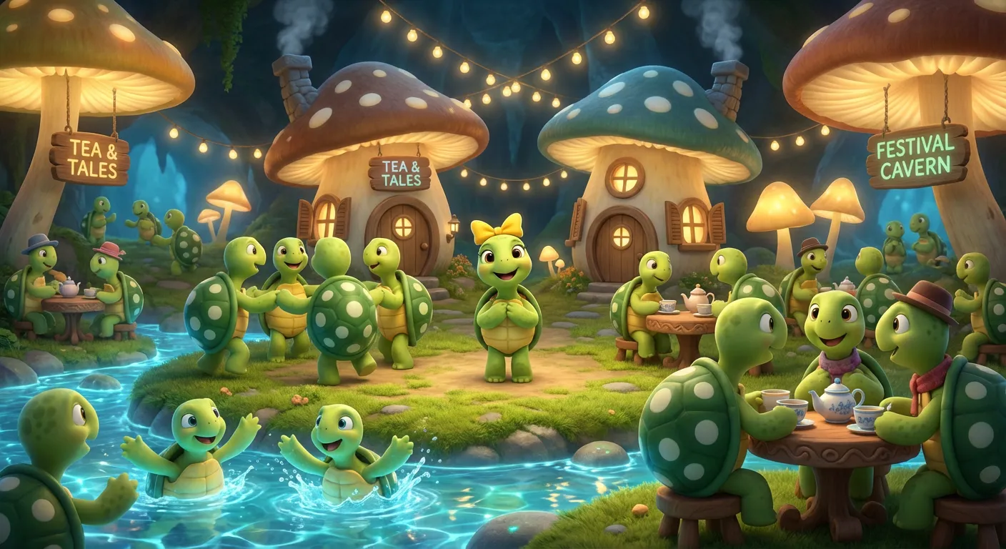 That night, Tilly invited all the other turtles down for a grand party beneath the earth. Everyone danced and splashed in the glowing pools, agreeing that you can never judge a mushroom by its cap.