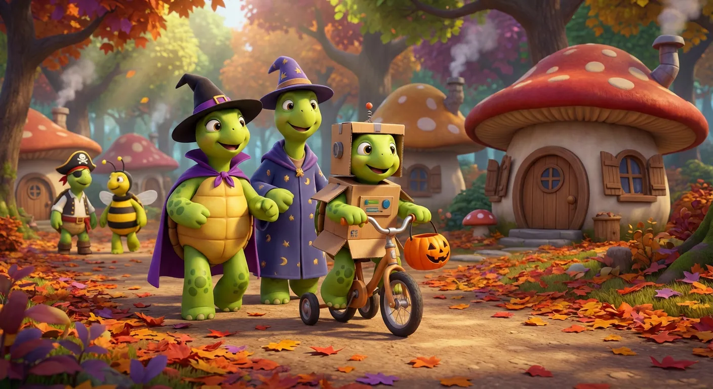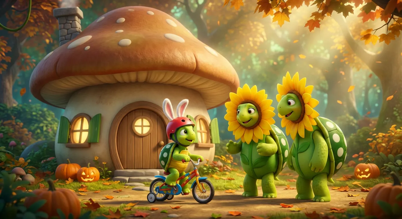 Leo wanted to be the fastest creature in the forest, so he taped long, fuzzy pink ears to his red bicycle helmet to look like a hare. Mom and Dad painted their shells bright yellow and wore green leafy collars to dress up as giant sunflowers.