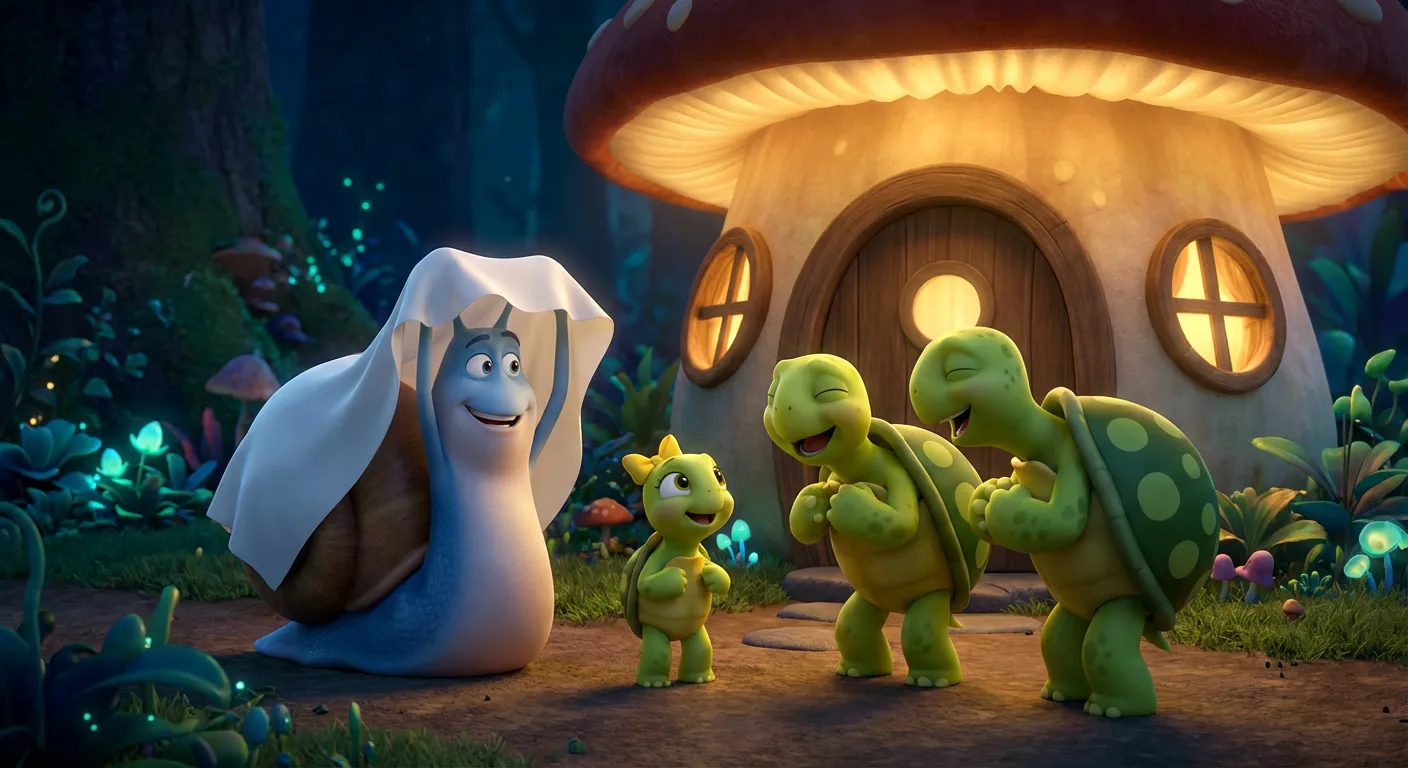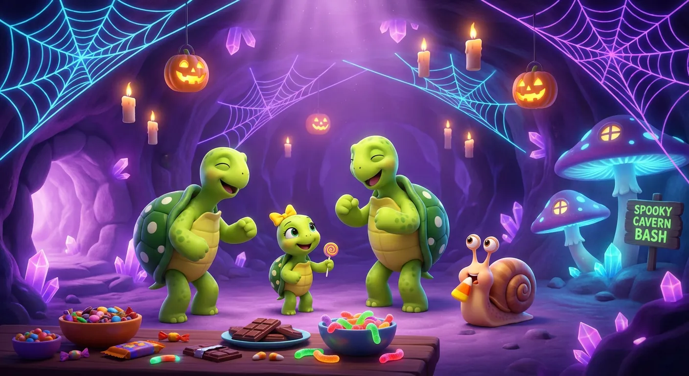 They all squeezed into the tiny house and slid down the slide to their secret underground home. The Snail had turned the crystal cave into a glow-in-the-dark dance floor for the best Halloween party ever.