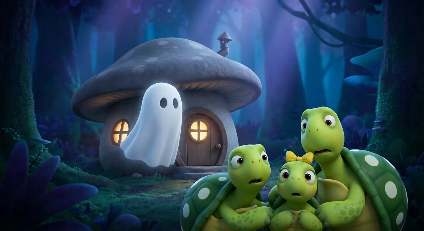 When they returned to their tiny gray mushroom house at the edge of the woods, they saw something strange. A white, floating shape was hovering right in front of their little door, making a low, moaning sound.