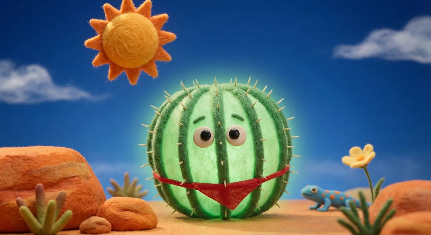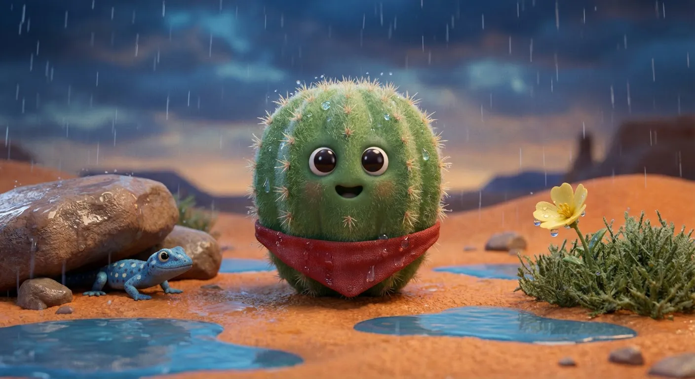 Deep in the orange desert, Barnaby the cactus waited for the clouds to turn gray. When the rain finally fell—*drip, drop, splash*—Barnaby opened his roots wide! He drank and drank, gulping down the cool water as fast as he could.
