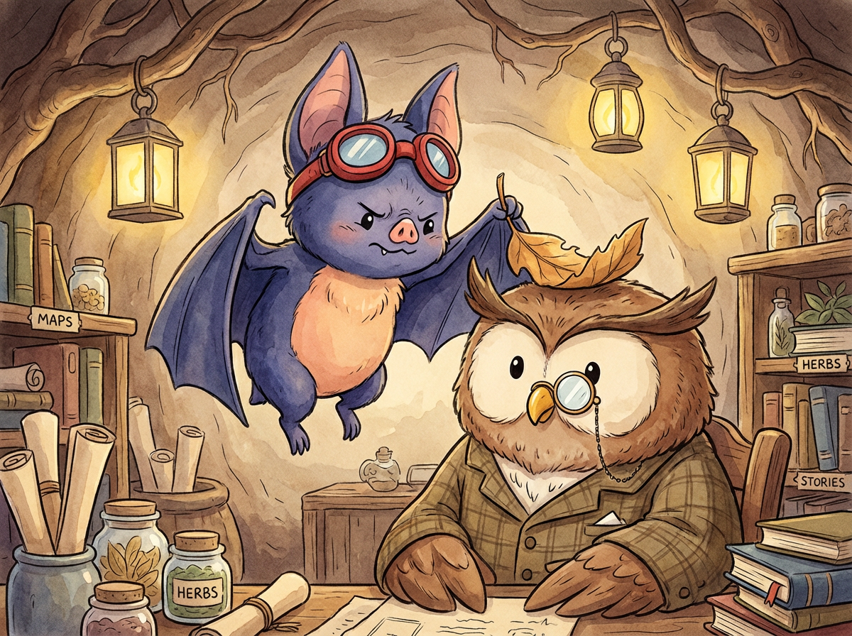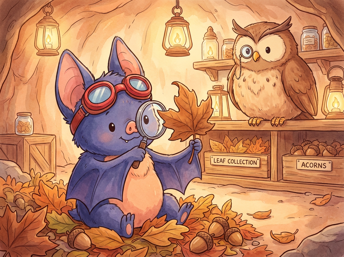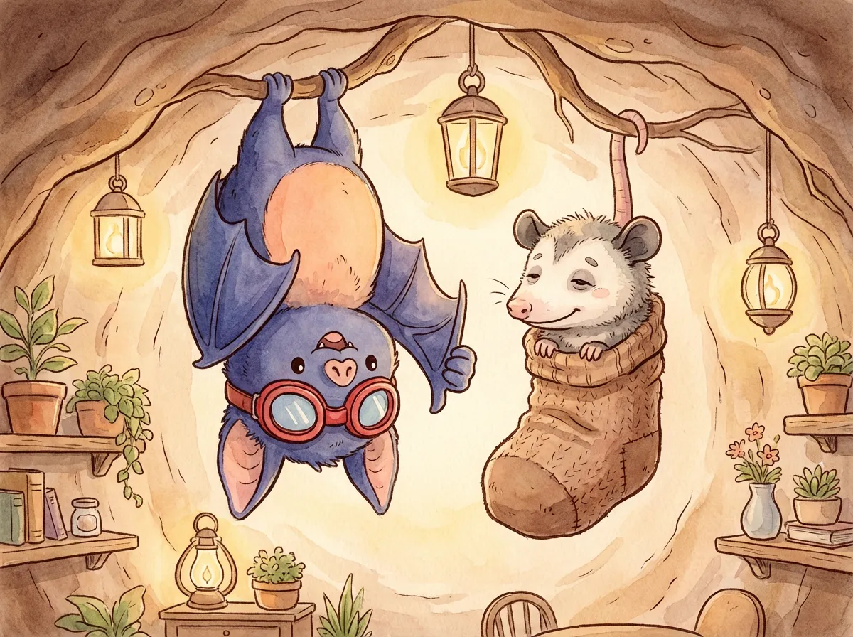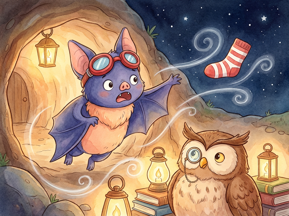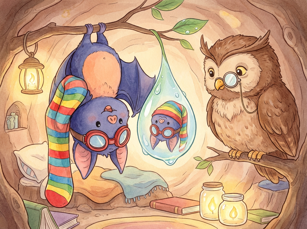 Batty admired his reflection in a dewdrop, turning his head from side to side to show off the striped sock still perched on his left ear. "This is not just a sock," Batty announced to the silent forest, "It is a Crown of Warmth! I am the king of cozy."