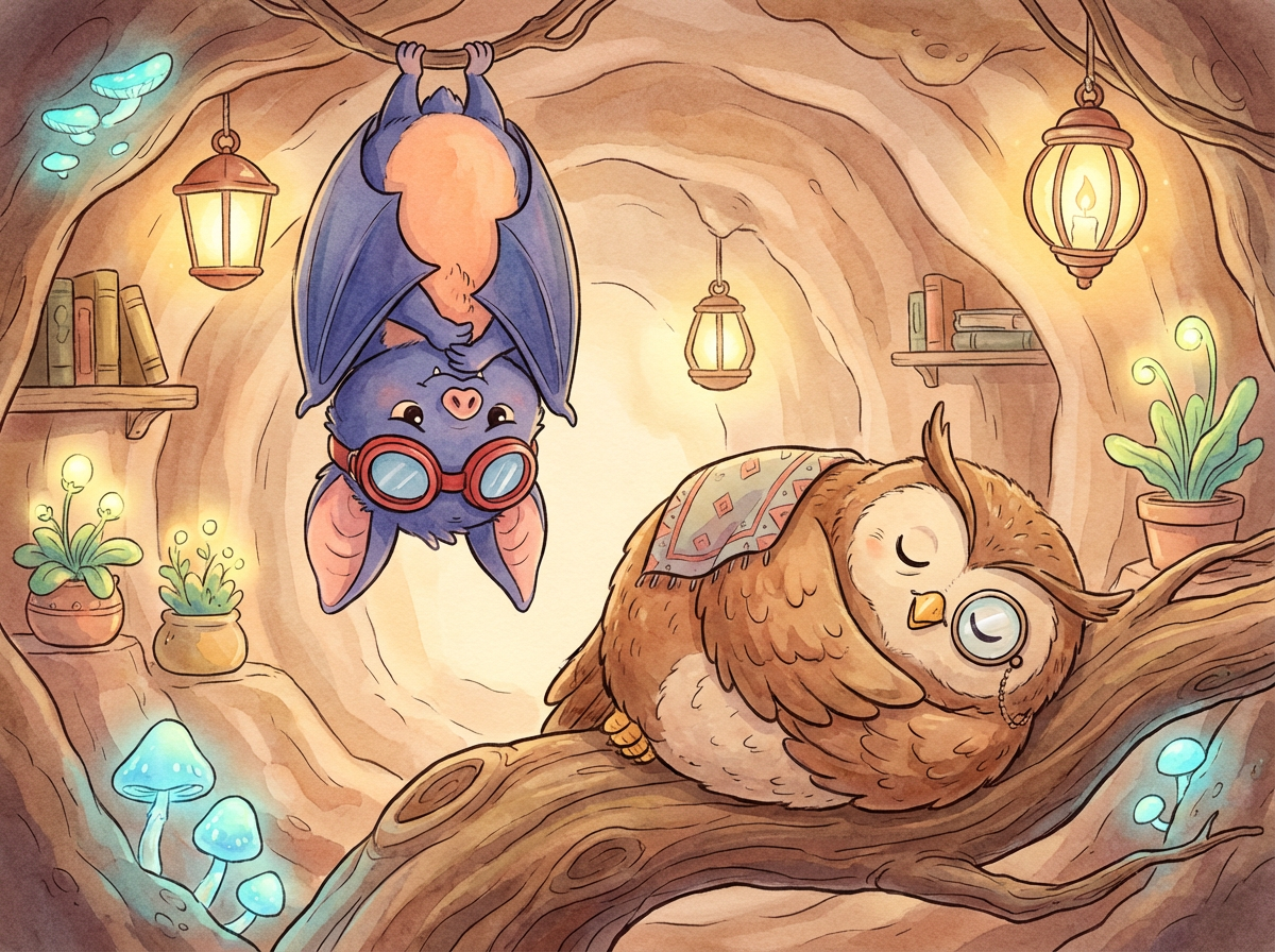 He glanced over at Professor Hoot, who was snoozing on a nearby branch with his feathers fluffed up against the chilly breeze. Batty felt a surge of generosity. "A king must look after his subjects," he whispered. "The Professor needs a hat, too!"