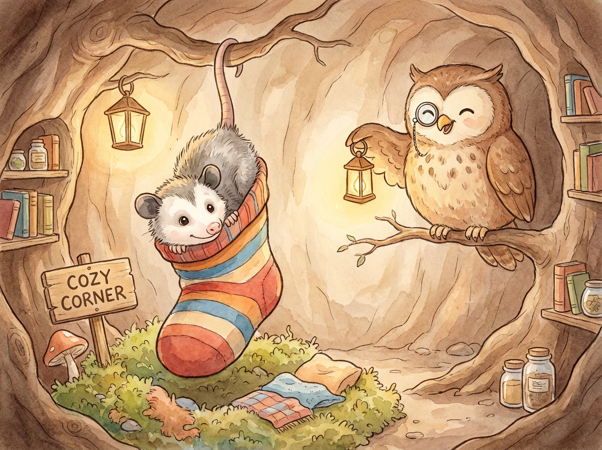 The sock drifted down, down, down, until it landed softly on the tail of a baby opossum hanging from a lower branch. The baby opossum squeaked in surprise, then wiggled backward until the sock covered him like a warm, colorful sleeping bag.