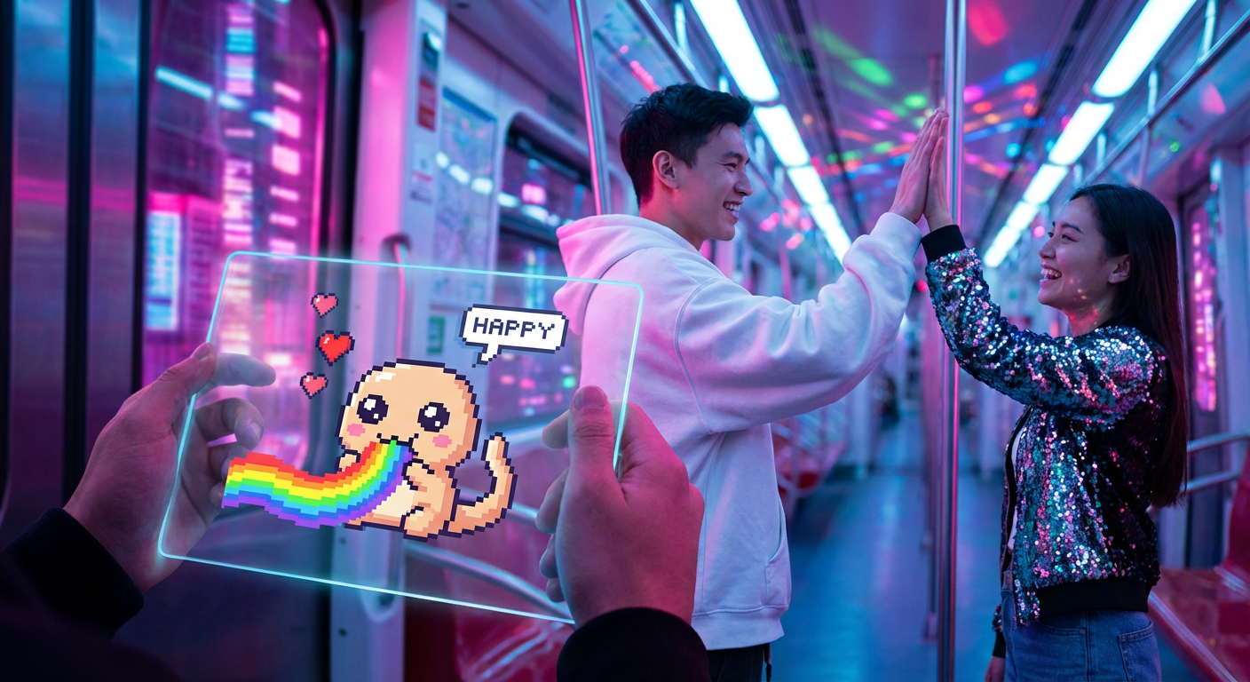 Inside the train, the seats were turning gray too! "Look over there!" shouted Kai, pointing to the ceiling. A tiny, blocky creature made of pixels was munching on the colorful lights.