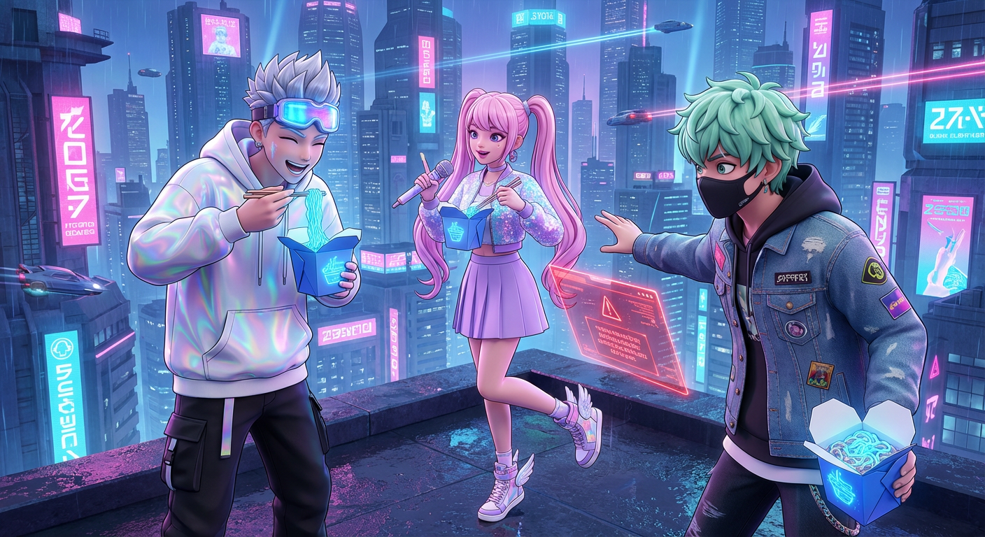 The team was enjoying a break on a rooftop, slurping glowing blue noodles. Suddenly, Jax’s tablet flashed red with a warning siren. "Trouble at the Sky Station!" Jax announced, pulling down his mask to take a sip of soda.