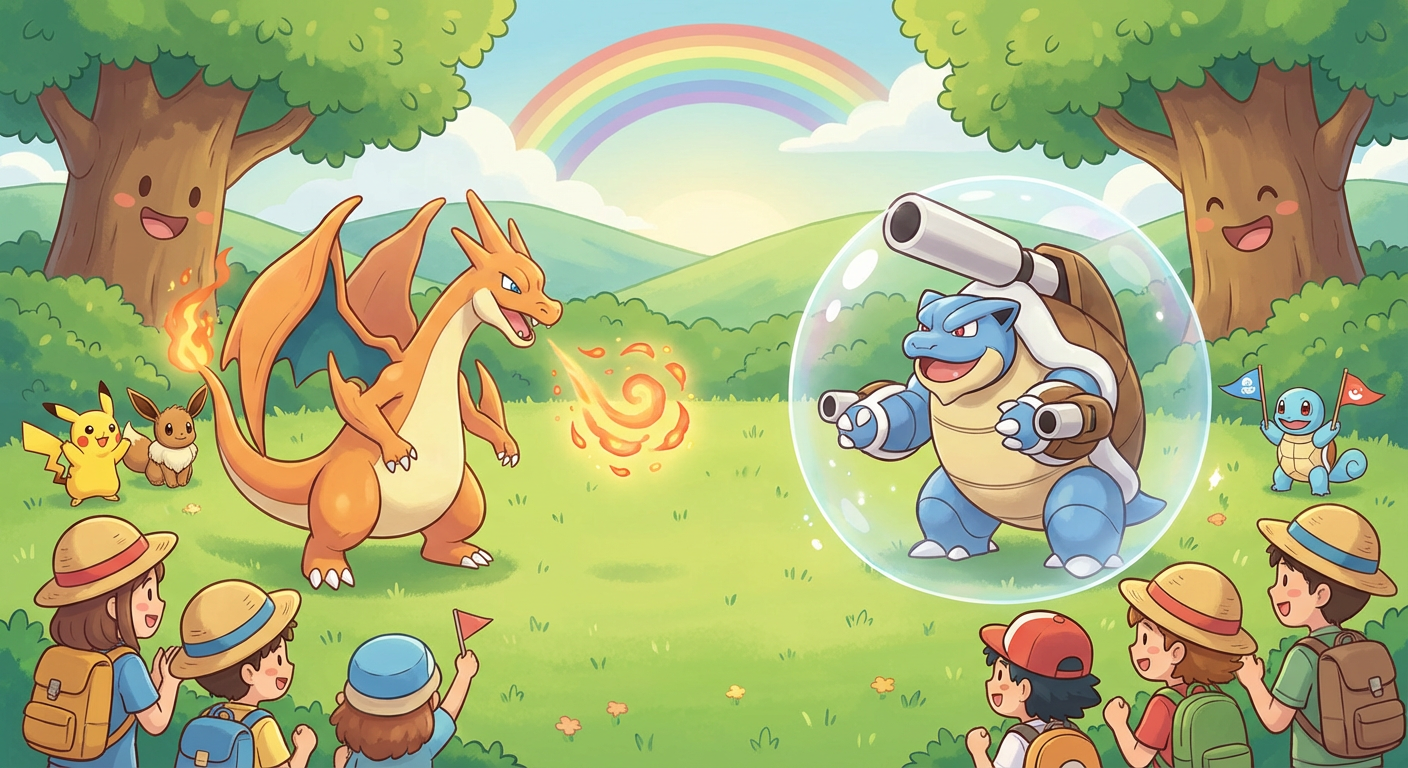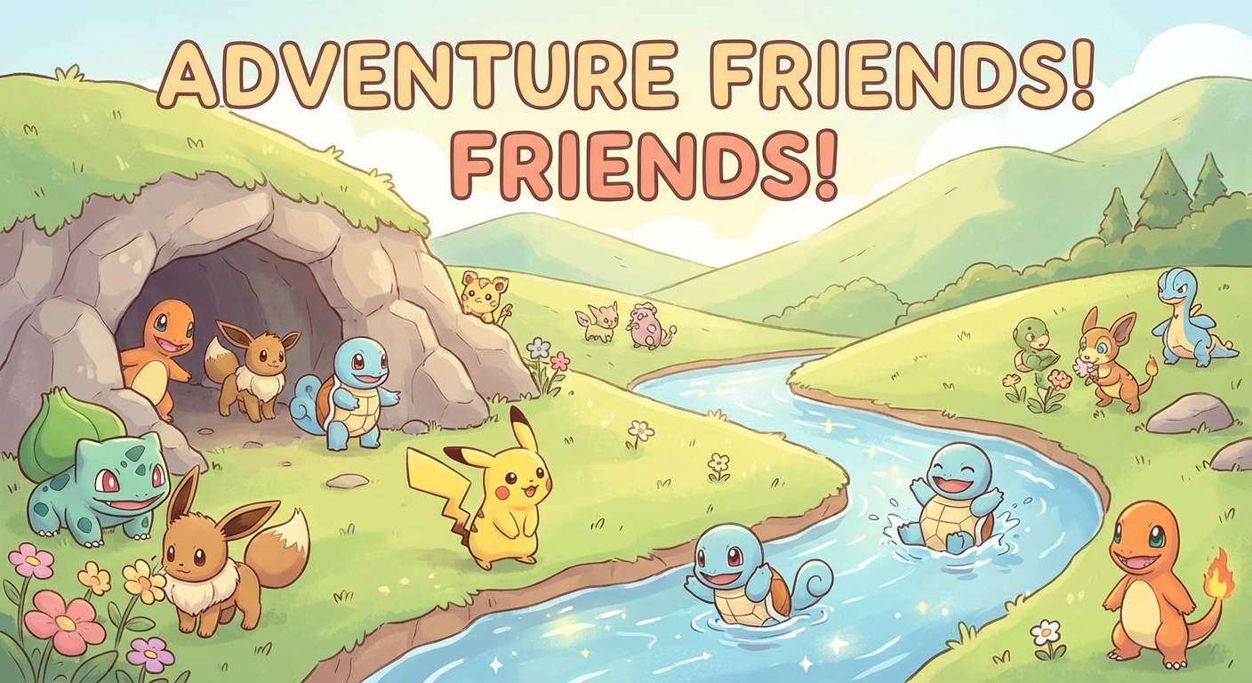 In a bright valley, lots of different Pokémon played together every day. But they all wondered, "Can we become even stronger?" They searched in tall grass, dark caves, and beside sparkling rivers, but they couldn’t find the answer.