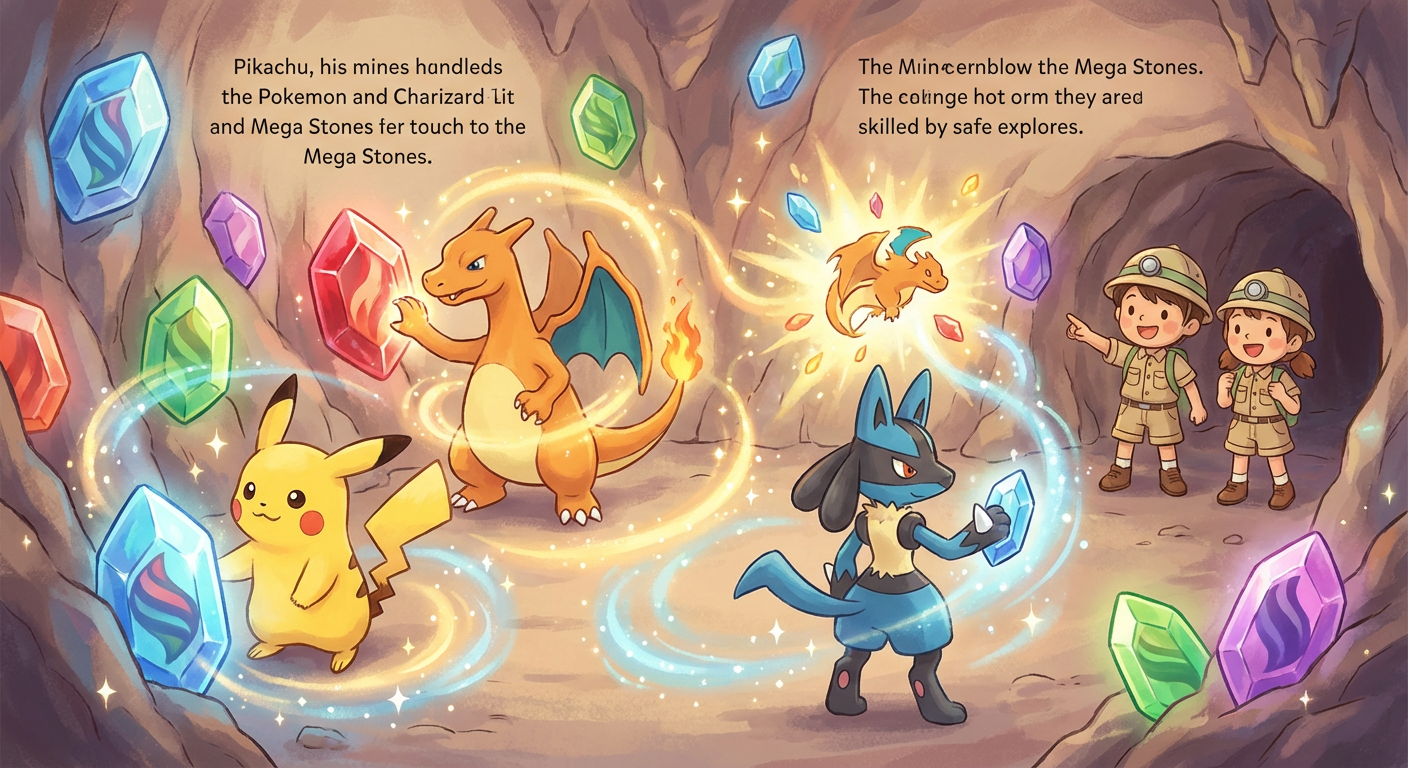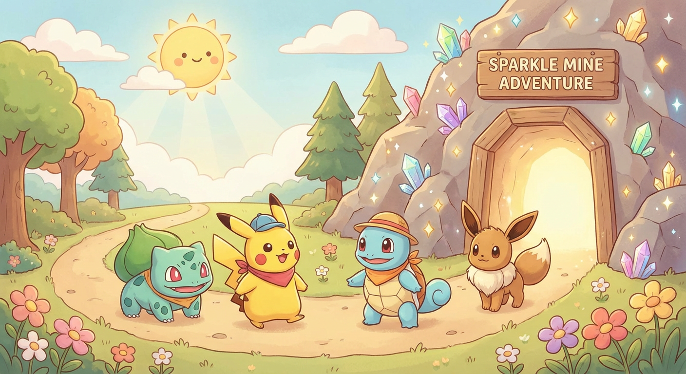 Once there were many Pokémon who could Mega Evolve, but they didn’t know it yet. One sunny day, they heard a whisper about a shiny mine full of secrets. So they walked together, brave and curious, to see what they could find.