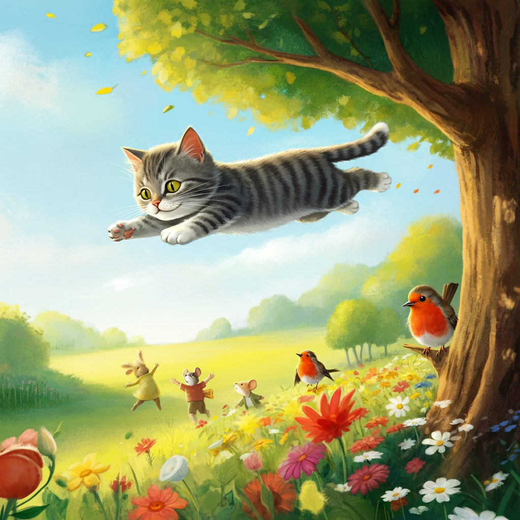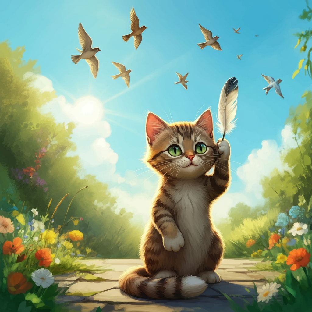Whiskers the cat loved to watch birds swoop and glide across the sky. "I wish I could fly too," he meowed softly. One sunny morning, he found a little feather on the ground and tucked it behind his ear for courage.